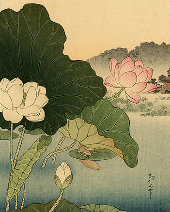 Hoy os proponemos escribir un haiku inspirado en esta grabado de Koho Shoda: «Una rana sobre una hoja de loto».