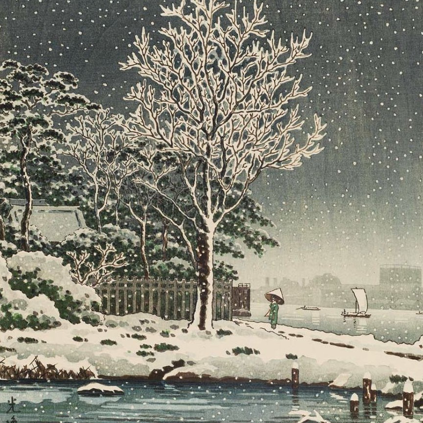Os invitamos, como cada domingo, a componer un haiku inspirado en este grabado de Tsuchiya Koitsu: «Suijin no Mori en el río Sumida»