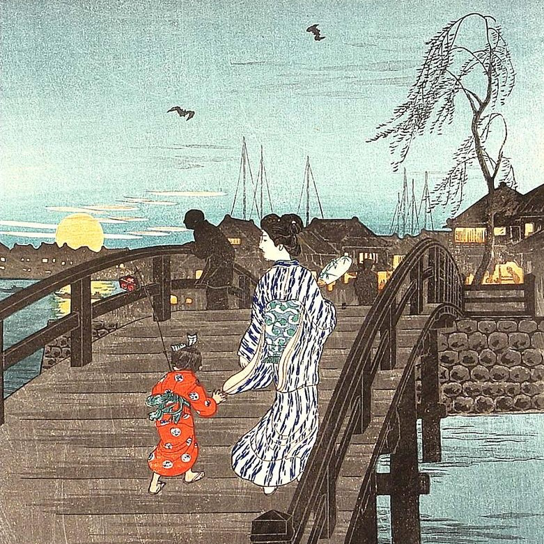 Escribe un haiku inspirado en este grabado de Shotei Takahashi: «Sale la luna en Minatomachi»