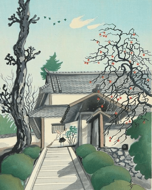 Esta información nos podría inspirar haikus donde la ventisca, el frío y la nieve sean los protagonistas indiscutibles. Sin embargo, y teniendo en cuenta el entorno que nos rodea a la mayoría de los miembros de este grupo, una imagen más acorde a lo que ocurre ahora mismo sería la que compartimos en este grabado de Bakufu Ohno titulado «Escena de principios de invierno». Donde podemos ver a un joven monje limpiando las escaleras del templo, y un enorme caqui que ya ha perdido todas sus hojas.