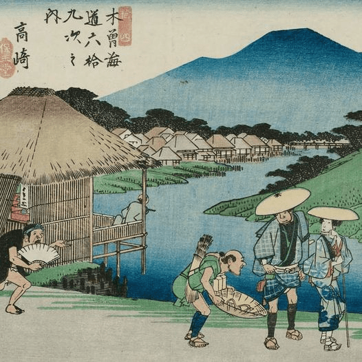 En el grabado de hoy, os presentamos la antigua estación de Kiso, obra de Utagawa Hiroshige, la número 14 de la serie de estaciones de la senda de Kiso y que se titula: «Takasaki»