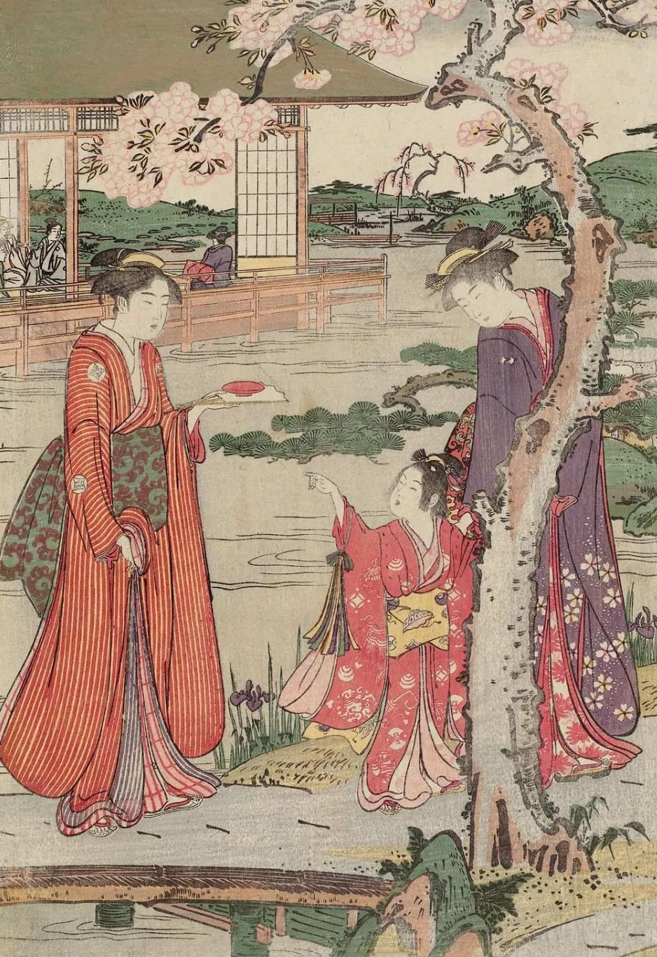 Jóvenes cruzan un puente bajo en un jardín de iris para hacer un picnic, posiblemente por el Hinamatsuri. Obra de Torii Kiyonaga titulada «Picnic in a Daimyô’s Garden»