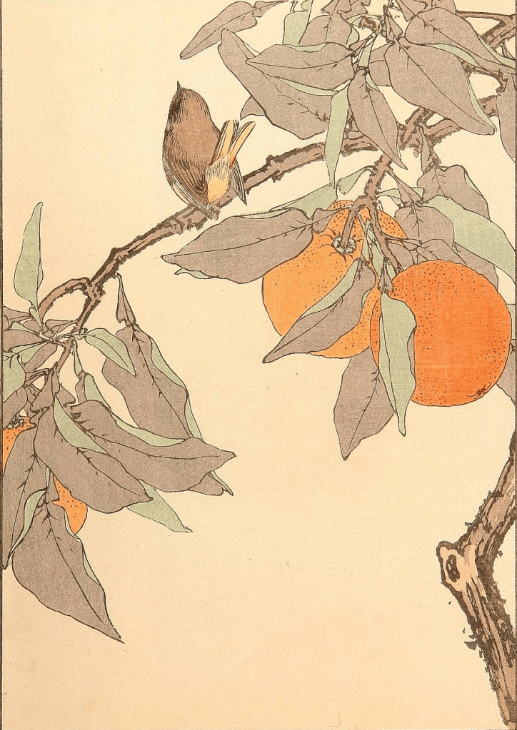 El siguiente grabado de Imao Keinen titulado: Mandarina Satsuma y pájaro, muestra una imagen donde los frutos tienen el color y tamaño perfecto para ser cosechados, y un pájaro que parece estar cantando al cielo.