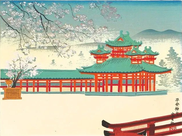 Así, hoy os queremos compartir este grabado de Tokuriki Tomikichiro titulado “Santuario Heian” en el que podemos ver un precioso santuario cuyo edificio principal fue diseñado para imitar al Palacio Imperial de Kioto.