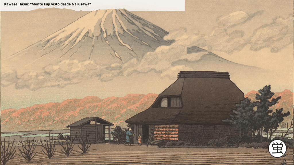 Ese cariño por la montaña se ha visto plasmado en obras como la que hoy compartimos para inspirarte en tu composición poética, un ukiyo-e de Kawase Hasui titulado Monte Fuji visto desde Narusawa.