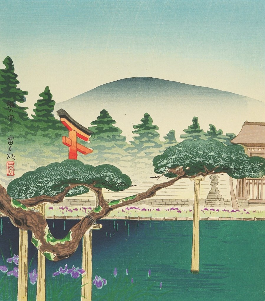 Tokuriki Tomikichiro creó un grabado que captura una imagen lejana de este santuario en el que se pueden apreciar el enorme Torii de la entrada así como la puerta principal del Santuario y el gran estanque central. Una obra titulada Santuario de Umenomiya dentro de su colección de 15 vistas de Kioto.