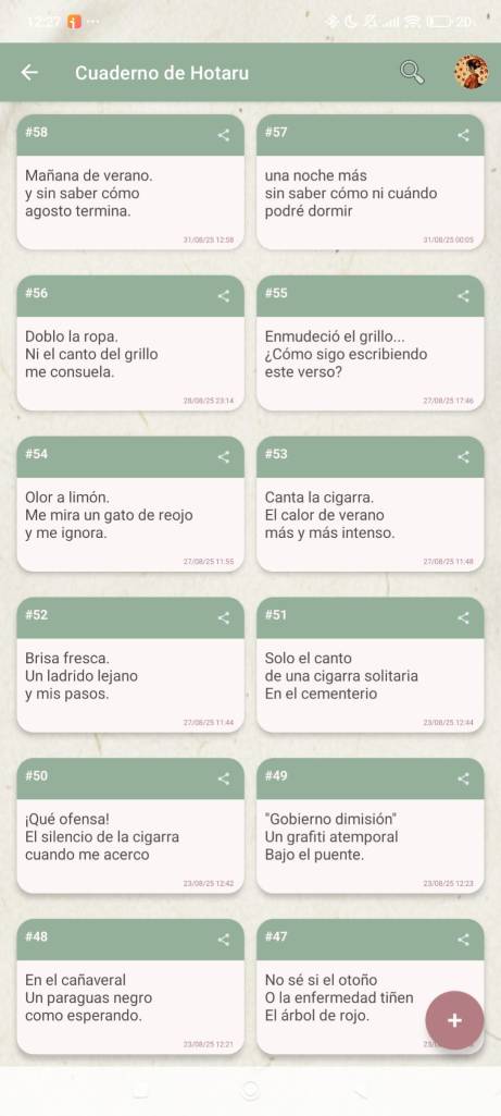 Además, cuando creas que tu versos están listos para compartir, podrás hacerlo directamente desde tu cuaderno, generando una imagen que muestre tu haiku o compilando una antología con todos los versos escritos bajo un mismo usuario.