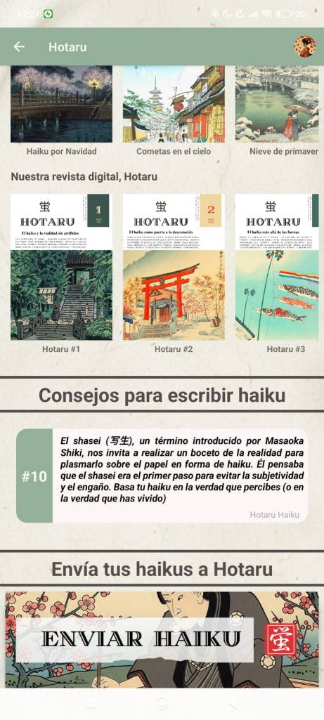 Desde la aplicación puedes enviarnos tantos haikus como desees. Nuestro equipo los revisará cada mes y los publicará en nuestra web, redes sociales y revista digital en una nueva sección dedicada a las personas que usáis Hotaru Haiku.