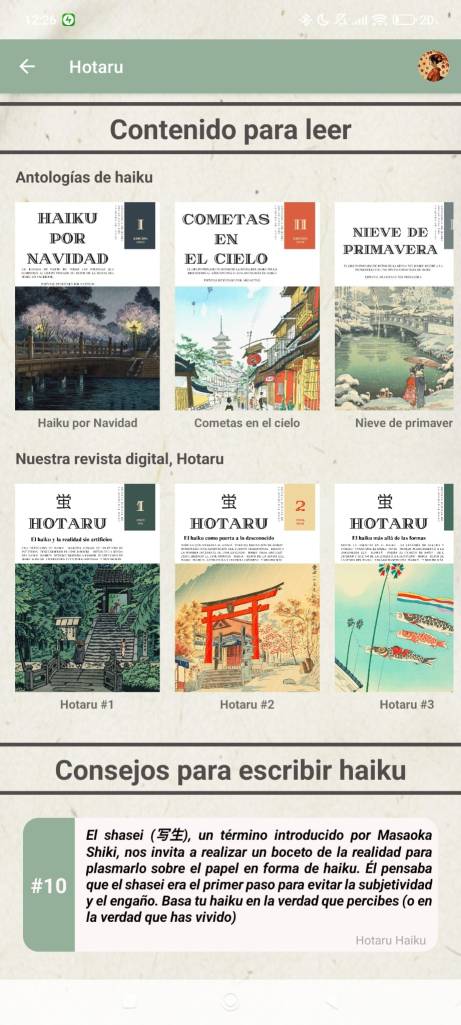 A continuación de esta primera sección de escritura, encontrarás un apartado donde tendrás acceso directo a todas las antologías publicadas en nuestra librería digital así como a todos los números de nuestra revista Hotaru. En esta sección iremos incluyendo nuevas obras exclusivas para la aplicación móvil, así como traducciones y otros recursos que consideremos interesantes para el aprendizaje de esta forma poética.