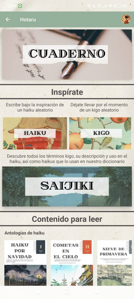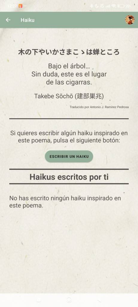 Una vez creas tu primer perfil, podrás acceder a él pulsando sobre la imagen. Una vez dentro, lo primero que verás será tu cuaderno, donde podrás escribir tantos haikus como quieras, una sección de inspiración para que puedas escribir basándote en haikus de nuestra base de datos o en nuestra colección de términos kigo. Además, también tendrás la opción de entrar a nuestro saijiki donde podrás hacer búsquedas de términos clasificados por estaciones y categorías.