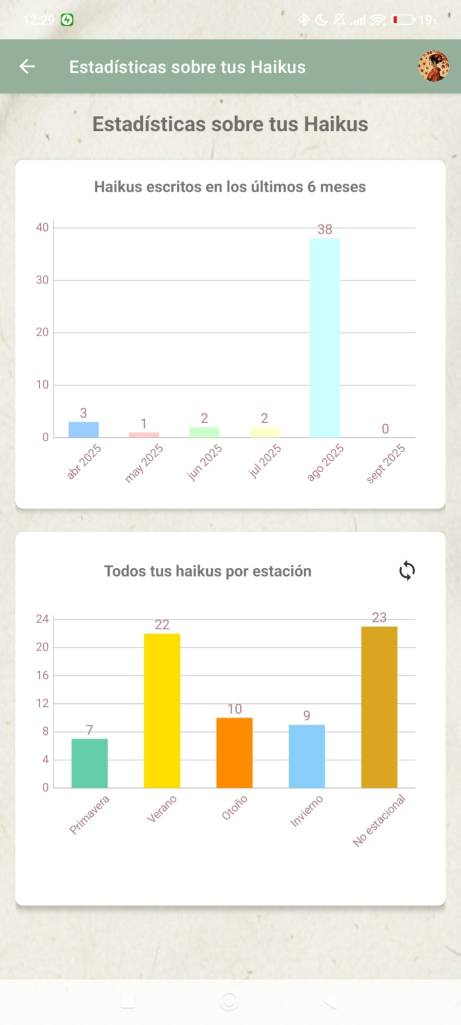 Esta opción permite consultar cuántos haikus has escrito en los últimos 6 meses y obtener una visión general de la estación en la que te has inspirado. Para obtener estas métricas, la aplicación analiza cada haiku y comprueba si utilizas alguno de los kigos registrados en la base de datos. Así que es probable que los números no sean del todo rigurosos porque podría darse el caso de que algún haiku contenga varios kigos o de que, incluso, contengan kigos de estaciones distintas. No obstante, es una buena aproximación para conocer qué estación te inspira más o en qué términos sueles basarte para escribir.
