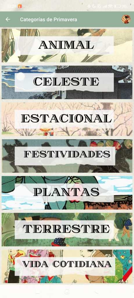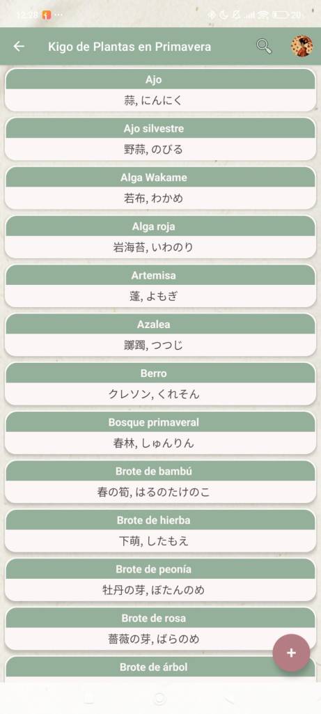 Así, una vez selecciones la categoría que desees, te abrirá una ventana con distintas tarjetas de términos kigo, que podrás pulsar para ampliar el detalle: